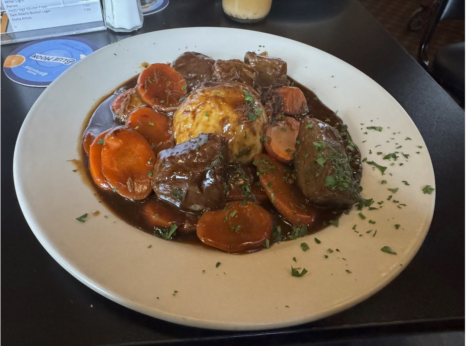 Selection of entrees: Braised Beef Burgundy with Potatoes, Carrots & Onion, Baked Salmon Oregenette, or Chicken Picatta with Pasta.